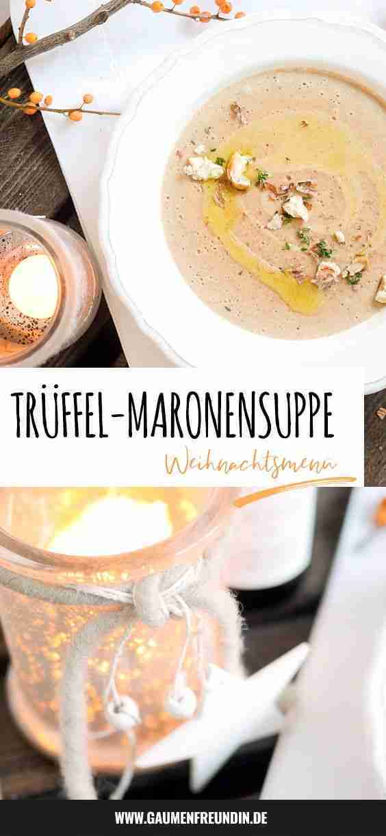 Werbung. Feine Maronensuppe mit Creme Fraiche, Trüffelöl und Thymian – eine sensationell leckere Suppe, die perfekt als Vorspeise zum Weihnachtsmenü passt – Gaumenfreundin Foodblog #maronen #trüffel #suppe #weihnachten