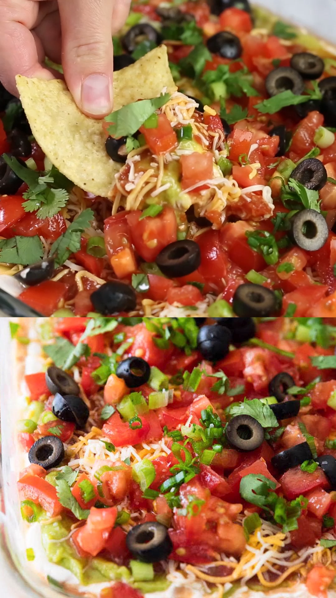 7 Layer Dip Recipe – Layers of salsa, guacamole, sour cream, beans, cheese, pico de gallo and olives. The perfect appetizer for game day or a friends get-together. People will gather around this layered taco dip until it’s gone! #appetizers #mexicanfoodrecipes #mexicanfoo