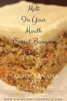 Carrot Banana Cake with Cream Cheese Frosting! Our recipe is simple, delicious and MOIST! Ripe Bananas and sweet carrots is what makes this cake sweet! Only 1/2 cup of Cane Sugar in the cake and 1 cup in the Frosting! That makes our Melt in your Mouth cake a little healthier! #dininginwithdanielle #chrisdoeswhat