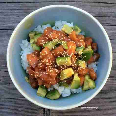 Un repas sain, coloré et délicieux. Du saumon cru et des morceaux d’avocat garnissent ce bol de riz. Le tout est arrosé d’une délicieuse sauce sucrée-salée.