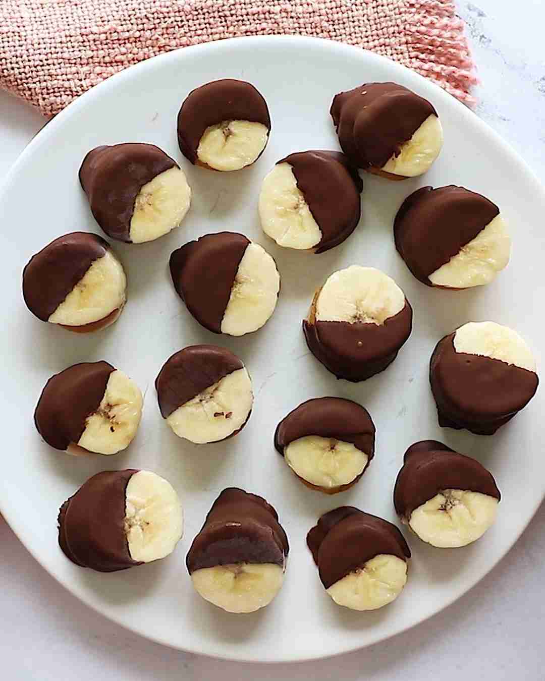 These frozen chocolate covered peanut butter banana bites are the perfect healthy warm weather treat. Keep a batch in the freezer for easy snacking and enjoy two bites for less than 100 calories! #eatingbirdfood #frozenbanana #vegandessert
