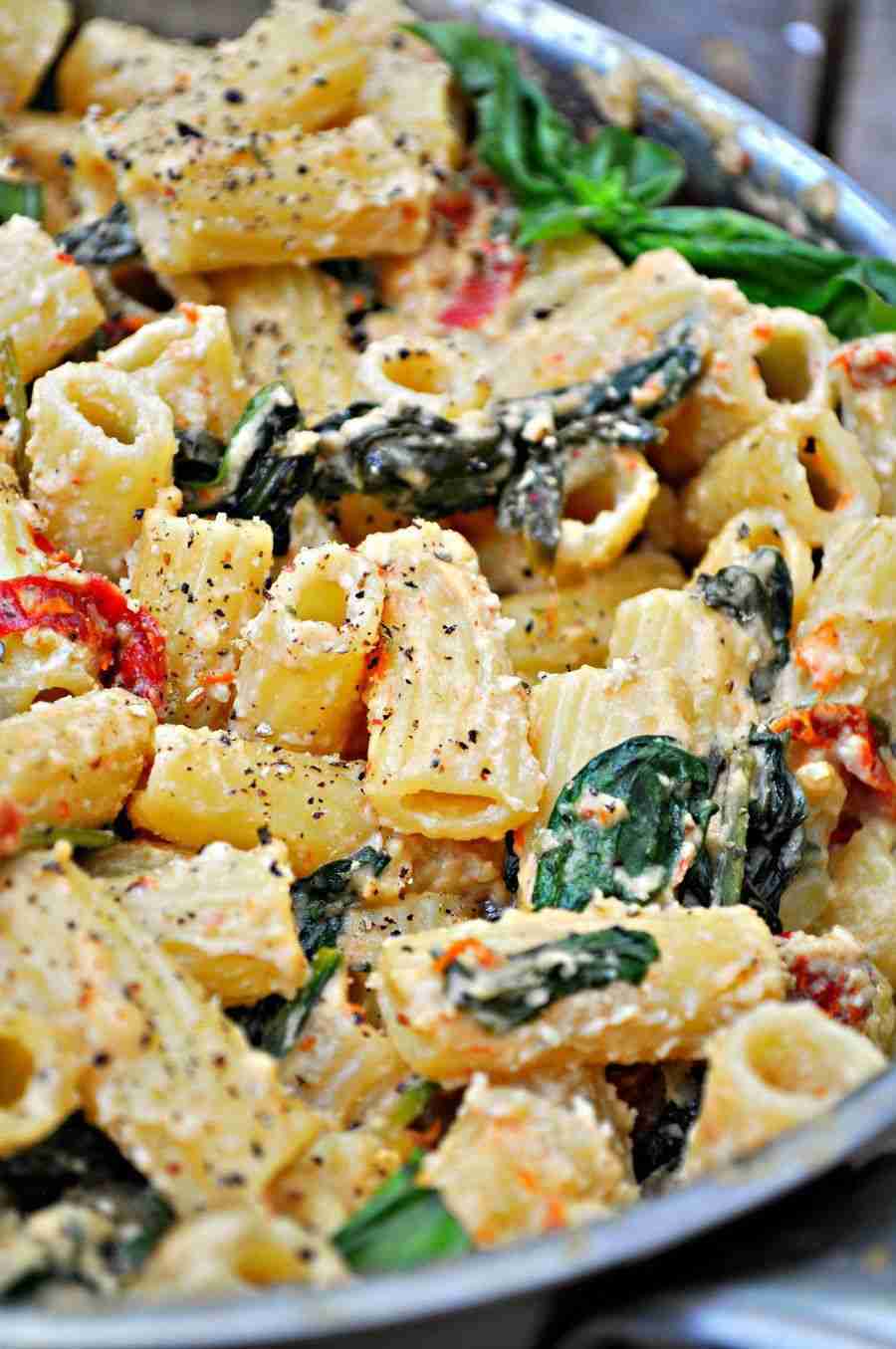 This vegan Tuscan Rigatoni is perfection! Garlicky spinach and sun dried tomatoes cooked in white wine and mixed with cashew cream, tossed with rigatoni!