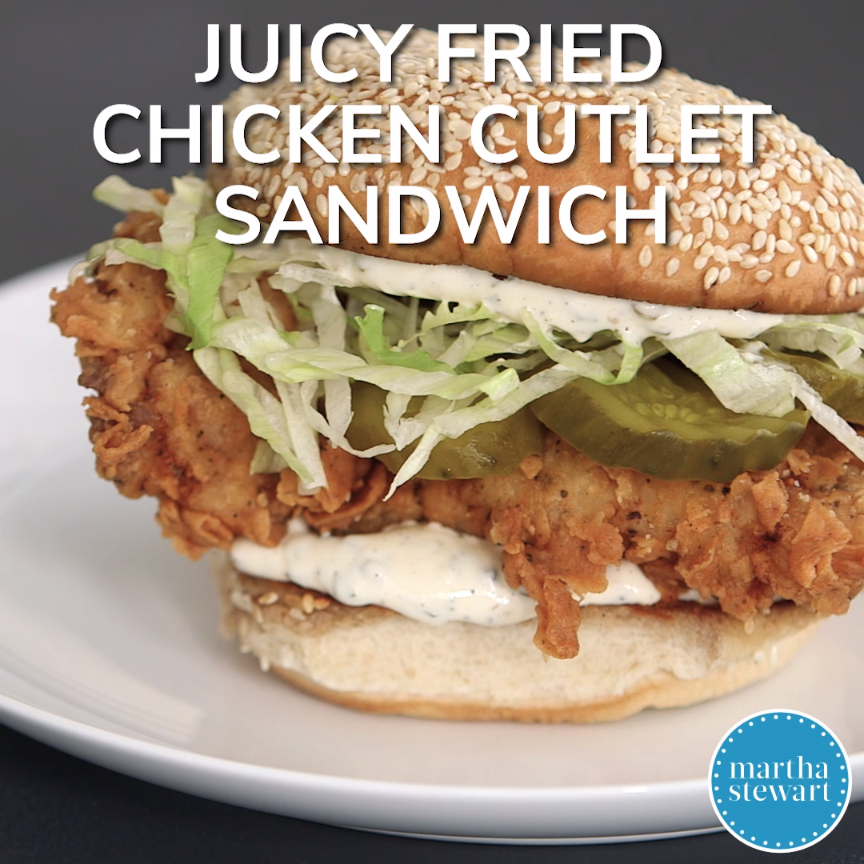 Fried Chicken Sandwich | A buttermilk fried chicken thigh with unbelievably crispy skin is the centerpiece of this hearty sandwich. It’s served on a squishy bun with homemade tartar sauce, shredded lettuce and dill pickles. Watch the video and get the recipe here. #food #recipe #marthastewart