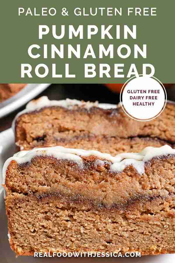 This Paleo Pumpkin Cinnamon Roll Bread is so easy to make and tastes incredible! Tender cake with a sweet pumpkin spice swirl and drizzled with a thick glaze. Gluten free, dairy free, and naturally sweetened.