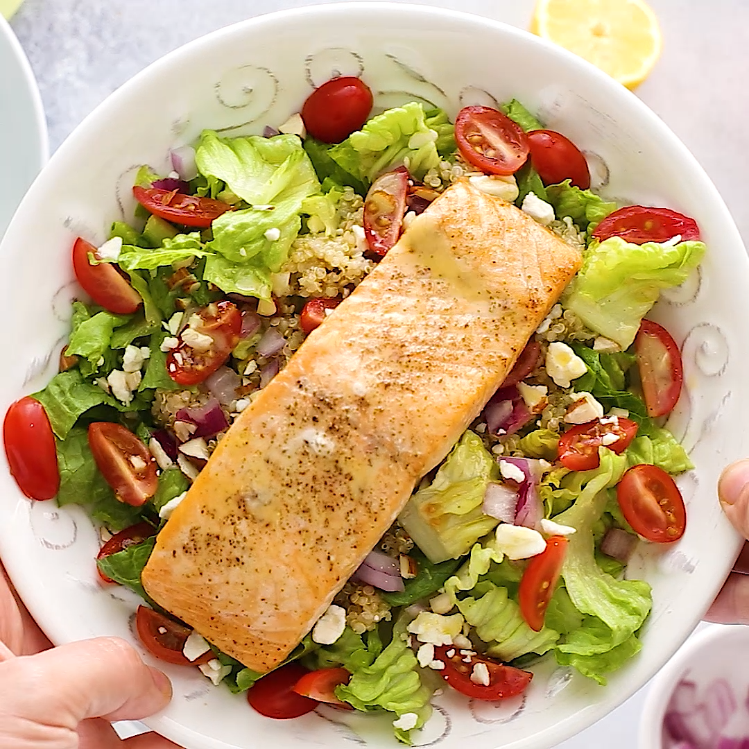 This Mediterranean salmon salad is loaded with flavor, incredibly healthy and gluten-free. Packed with tomatoes, quinoa, red onion, feta, almonds, and dressed with a lemon vinaigrette. #salad #salmon