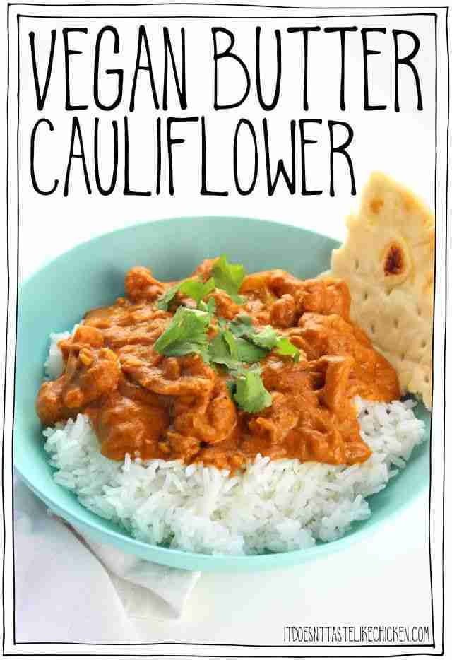 Indian butter chicken has been veganized! I present you Vegan Butter Cauliflower. A fraction of the calories and fat, but tastes even better. Super easy and quick to make, making a perfect weeknight meal. The sauce is whipped up in a blender, then pour over cauliflower and simmer. Done. #itdoesnttastelikechicken #veganrecipes