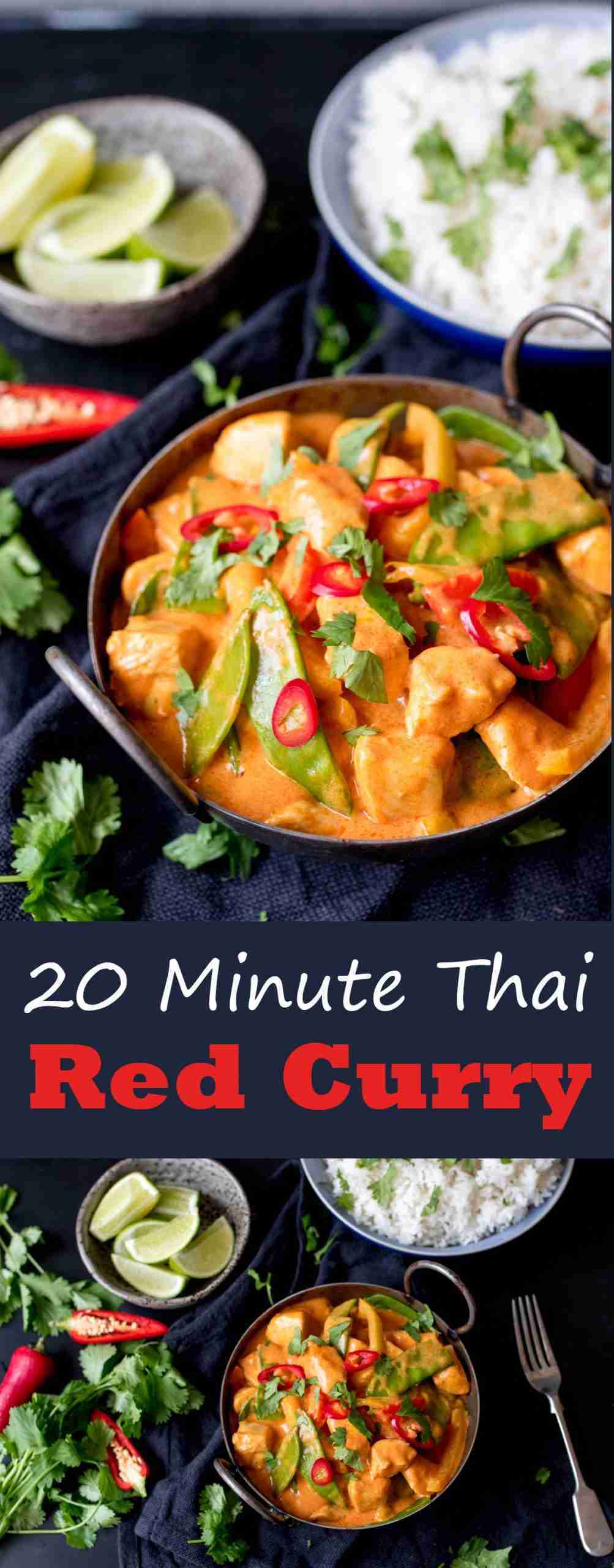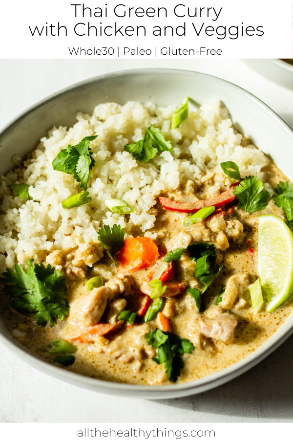 20 Minute Thai Green Curry with Chicken and Veggies! Tender chicken, fresh veggies, and flavorful aromatics, like ginger and garlic, all come together with green curry paste and creamy coconut milk for a quick 20 minute meal that everyone will love. This easy recipe is Whole30 compliant, Paleo, dairy-free, and absolutely delicious. #januarywhole30 #whole30reci
