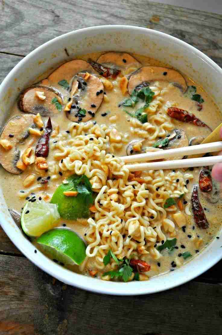 This vegan spicy Thai peanut ramen is amazing and so comforting. The broth tastes like a satay style peanut sauce and is so perfect with the ramen noodles! #veganeramen #ramenbowl #ramen #vegan