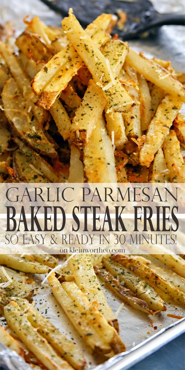 Garlic Parmesan Baked Steak Fries – so easy, ready in about 30 minutes. The perfect side dish to all your burgers, hot dogs & backyard BBQ fun. Delicious!