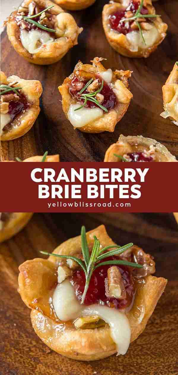 Cranberry Brie Bites are a sweet and tangy bite-sized appetizer. Creamy baked brie in a flaky crescent roll cup topped with sweet cranberry orange sauce.
