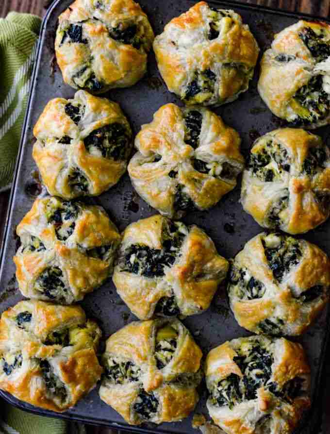 Spinach and Feta Puff Pastry Appetizers – flaky mini bites that are loaded with savory flavors. An easy make-ahead finger food recipe for any get-together that your guests will devour. Perfect for any dinner party. #appetizers #fingerfoods #puffpastry