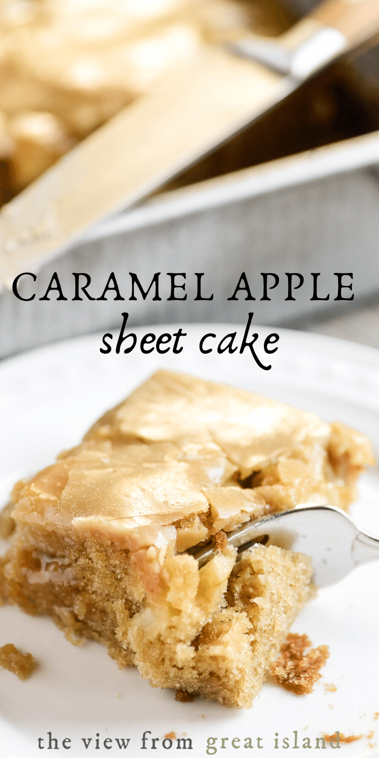 Caramel Apple Cake is a moist apple sheet cake glazed with a thick layer of caramel icing ~ a favorite fall apple dessert and so easy to make! #easy #recipe #applecake #sheetcake