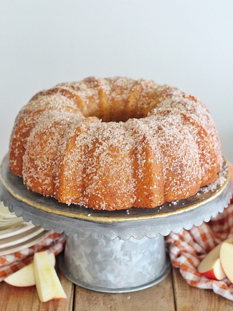Apple Cider Donut Bundt Cake – a tender and moist apple cinnamon bundt cake with a cinnamon sugar dusting. #cakebycourtney #appleciderdonut #appleciderdonutcake #budntc