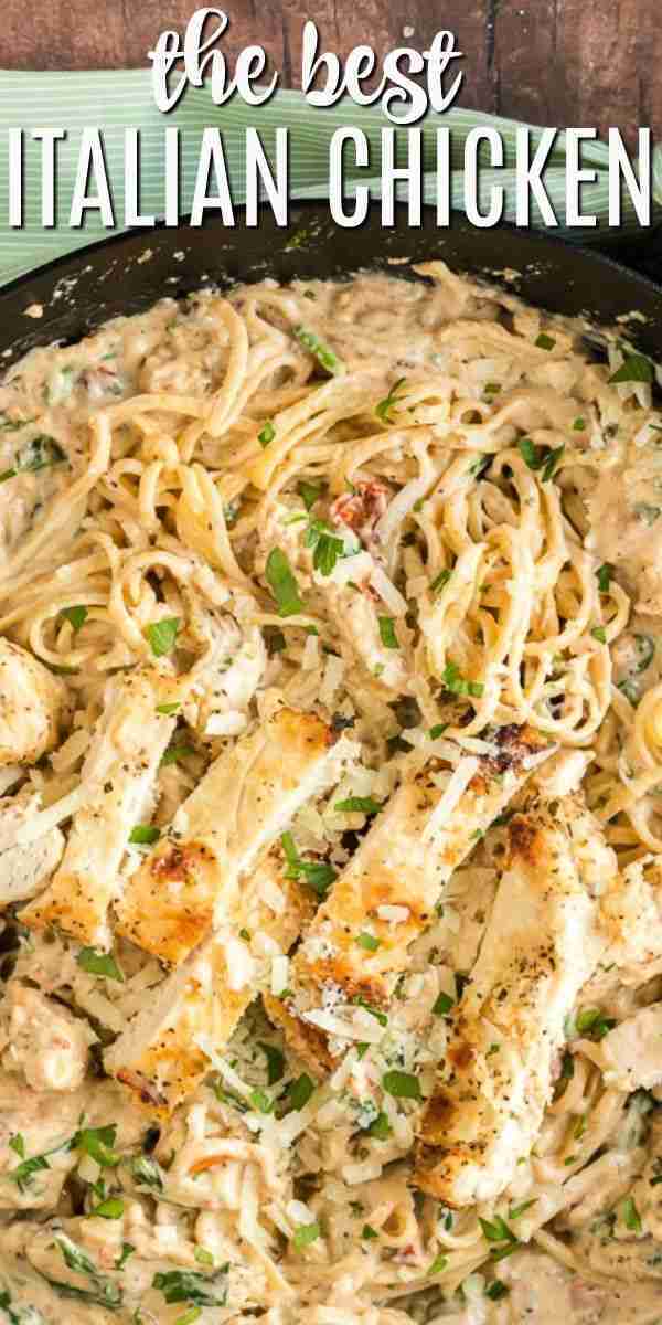Dinner in 30 minutes with this Creamy Italian Chicken Pasta recipe. Packed with flavor from spinach, garlic, and sun dried tomatoes, your family will gobble this easy dinner right up!