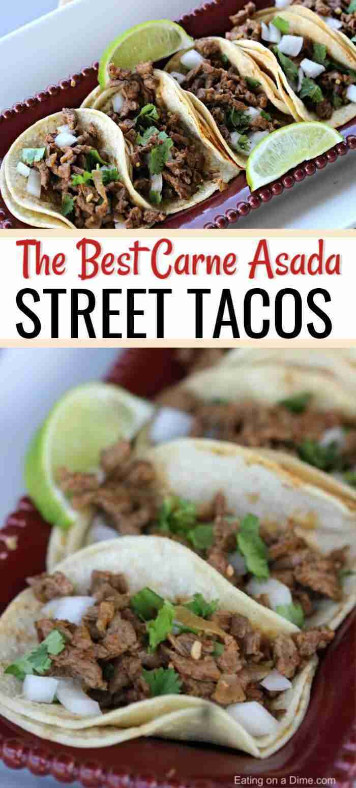 Are you looking for a quick and easy recipe for those busy weeknights? These carne asada street tacos are simple to make and the entire family will love the amazing flavor and tender steak. Your family is going to love this delicious and simple street taco recipe with meat and corn tortillas! #eatingonadime #recipes