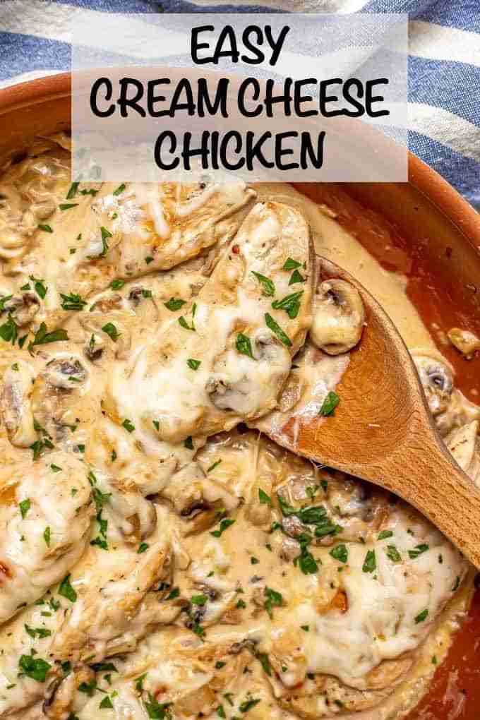 Easy cream cheese chicken is just a few basic ingredients and simple to make, with a deliciously creamy sauce that coats every piece. Ready in less than 30 minutes! #chickenrecipes #chickendinner #dinnerideas
