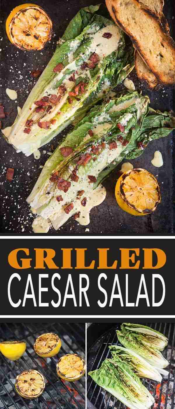 An easy recipe for grilled romaine Caesar salad elevated with crispy pancetta (or bacon), grilled lemon, and grilled croutons. The perfect side dish for grilled meats or backyard BBQ! #grilledcaesar #grilledsalad #grilledromaine