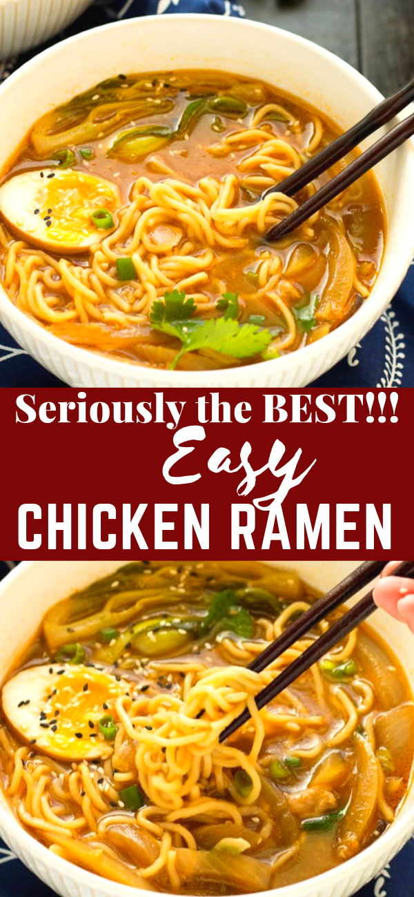 This Easy Chicken Ramen can be made at home in about 30 minutes! A flavorful broth with chicken and noodles, and don’t forget the ramen egg! #dinnerrecipe #dinner #chickenrecipe