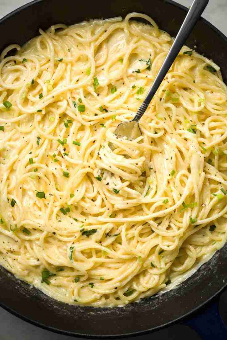 Creamy Three-Cheese Spaghetti This AMAZING ultra-creamy and cheesy spaghetti is inspired by the blog Julia's Album and can be yours in just 15 minutes | Spreading like wild fire on facebook | Delicious