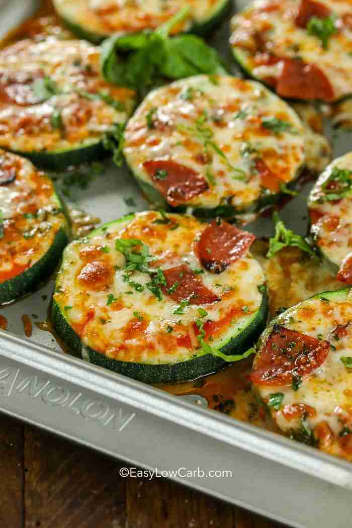Zucchini Pizza Bites are one of our favorite snacks! These delicious pizza bites are topped with our favorite toppings and plenty of cheese for the perfect low carb pizza fix! #easylowcarb #keto #zucchini #zucchinipizzabites #zucchinipizza #pizzabites