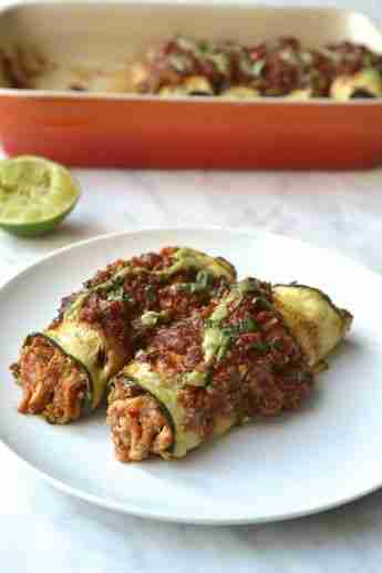 A healthy and low carb alternative to traditional enchiladas. Delicious saucy shredded chicken wrapped in zucchini strips (Paleo, Whole30, Gluten Free, SCD)