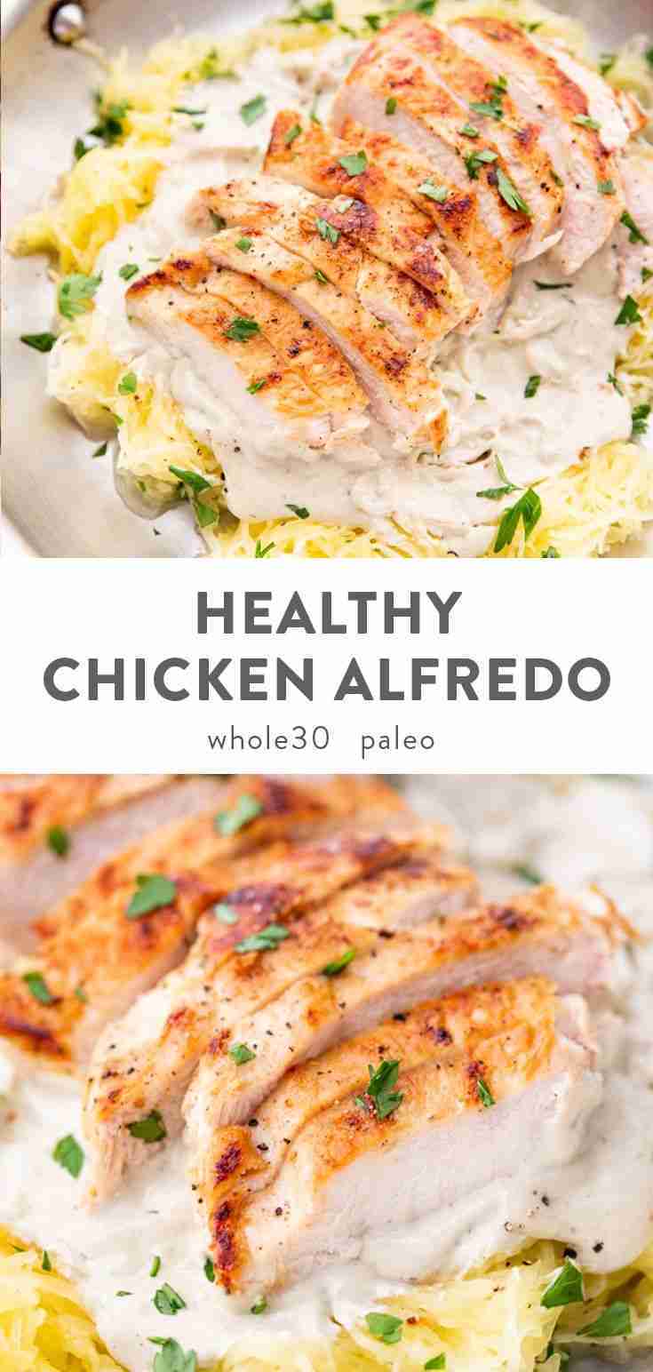 A rich and creamy chicken alfredo that’s super healthy! Quick and easy to throw together, this healthy chicken alfredo recipe uses a dairy-free cashew alfredo sauce and spaghetti squash