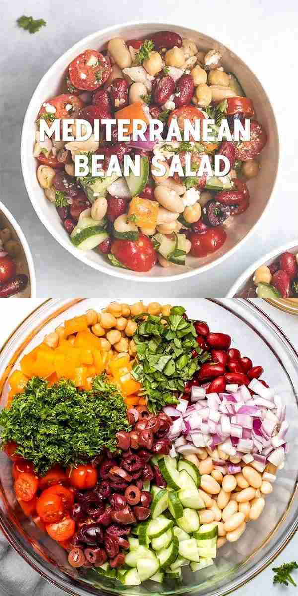 Mediterranean Bean Salad is a fresh and healthy side dish, made with 3 types of beans, a delicious vinaigrette, lots of vegetables and fresh herbs. Its perfect for meal prep, potlucks and as a side dish during grilling season. FOLLOW The Recipe Well for more great recipes!