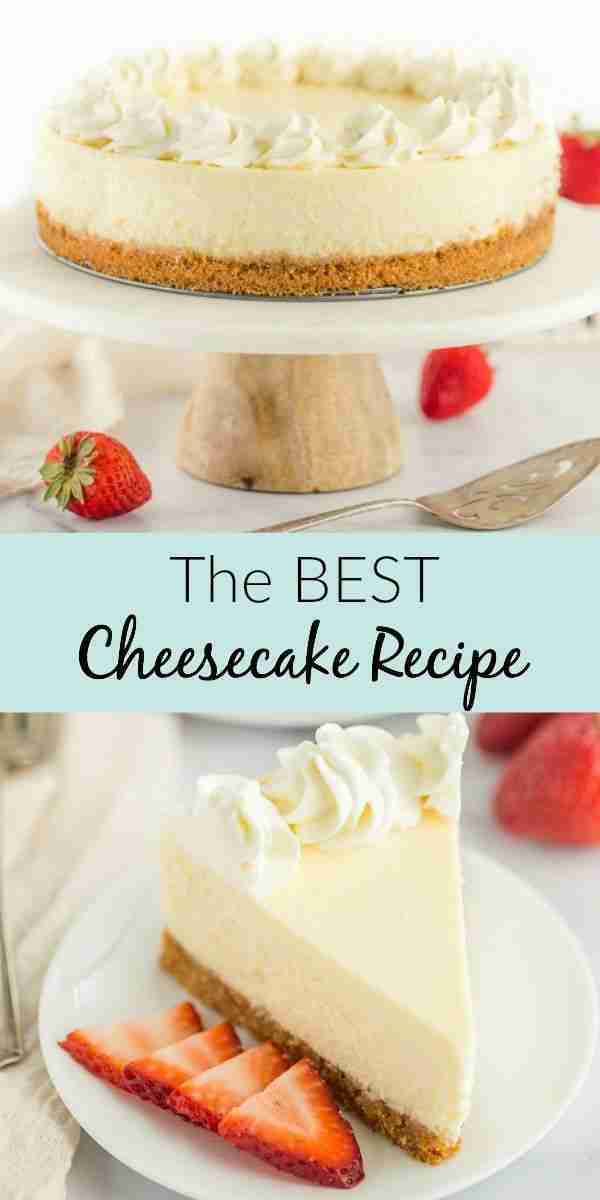 This Classic Cheesecake Recipe is super smooth, creamy, and topped on a homemade graham cracker crust. This post also includes a lot of helpful tips to get the perfect cheesecake every single time, plus different topping options to really make this recipe your own! #cheesecake #recipe #dessert