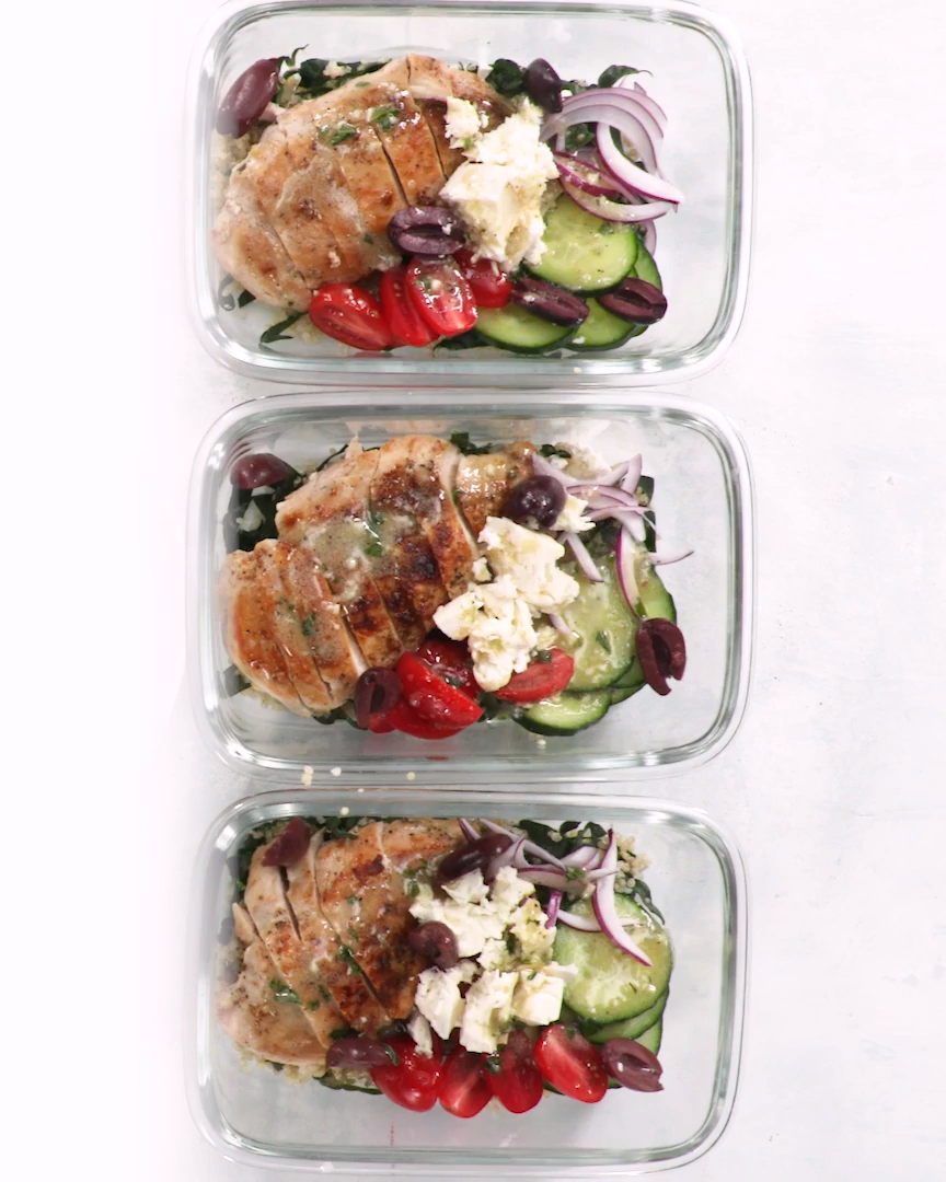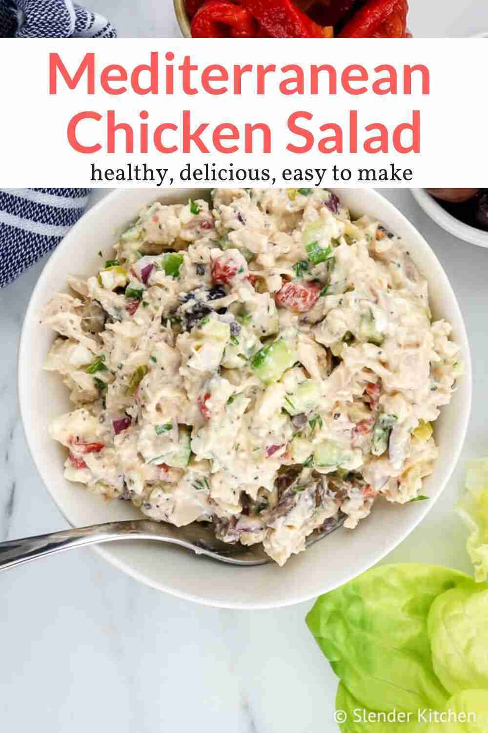 The best Mediterranean inspired healthy chicken salad with black olives, feta cheese, cucumbers, roasted red peppers, and dill in a creamy Greek yogurt dressing. Easy and delicious. This healthy recipe from Slender Kitchen has 2 Weight Watchers Freestyle SmartPoints and is low carb and gluten free. #lunch #makeahead