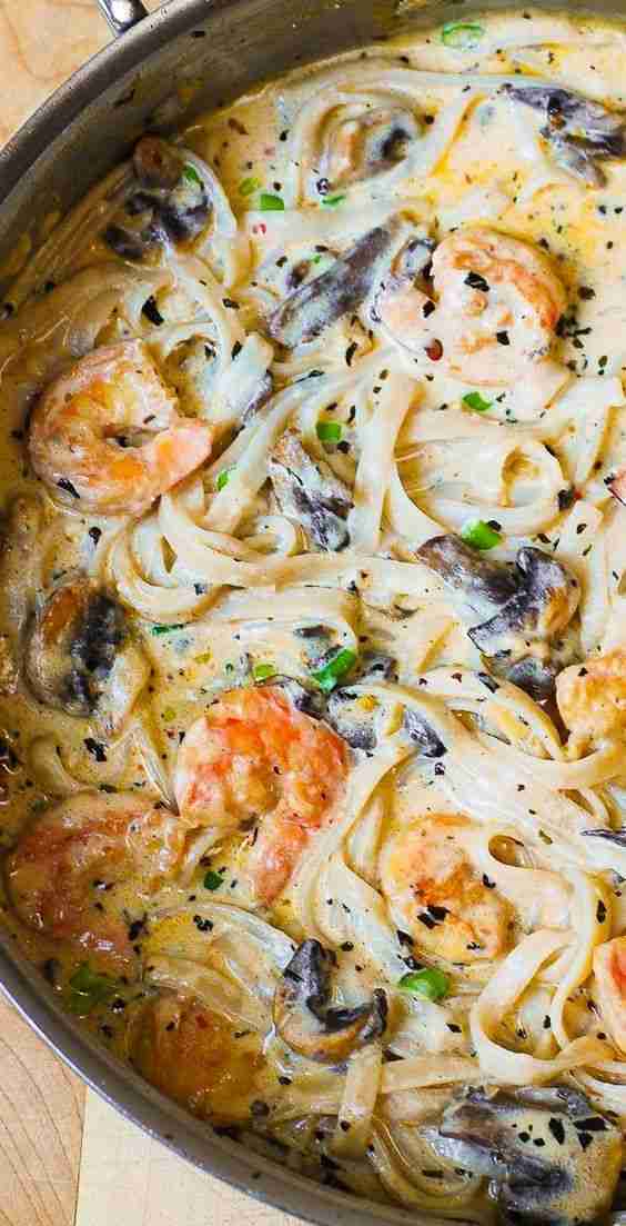 Creamy Shrimp Pasta with Mushrooms in a delicious homemade alfredo sauce. This recipe has all the flavors you’ll love: shrimp, mushrooms, garlic, basil, crushed red pepper flakes, paprika, Parmesan and Mozzarella cheese. #shrimp #shrimppasta #creamyshrimppasta