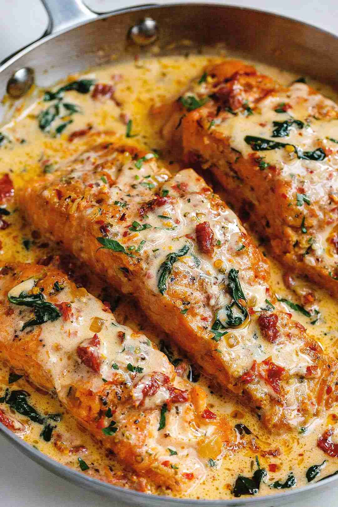 Creamy Garlic Tuscan Salmon With Spinach and Sun-Dried Tomatoes – #salmon #recipe #eatwell101 – Smothered in a luscious garlic butter spinach and sun-dried tomato cream sauce, this Tuscan salmon recipe is so easy, quick, and simple. –