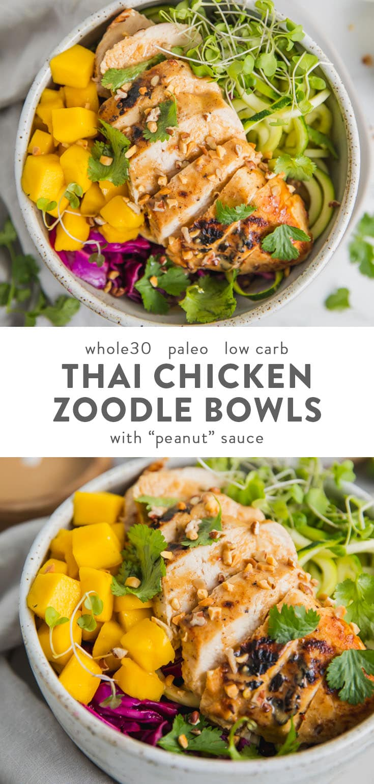 Whole30 Thai Chicken Zoodle Bowl (“Peanut” Sauce, Paleo, Low Carb)