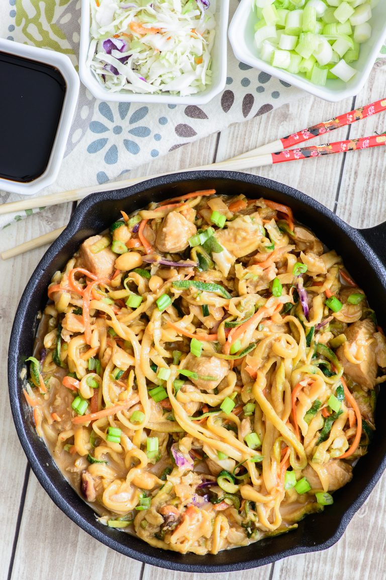 One Skillet Thai Peanut Chicken Zoodle Bowl